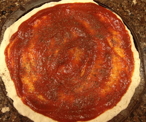 - Grease pans with olive oil and sprinkle with cornmeal. Place dough on pans and push the dough evenly to the edges of the pan. You can push a little extra out to the edge if you like a thick crusty end to your pizza.